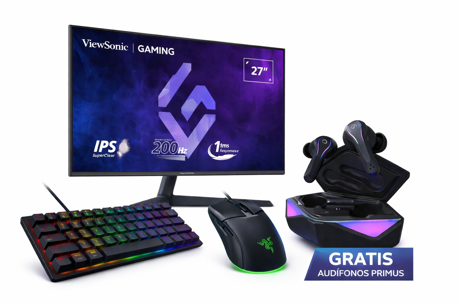 Este Combo Gaming ViewSonic y Razer ha sido meticulosamente seleccionado para ofrecer una experiencia de juego profesional, combinando la fidelidad visual de ViewSonic con la precisión legendaria de la ingeniería Razer. El pilar central es el monitor ViewSonic VX2729 de 27 pulgadas con panel IPS. Este monitor no solo ofrece colores vibrantes y ángulos de visión de 178°, sino que su frecuencia de actualización de 180Hz y un tiempo de respuesta de 0.5ms eliminan por completo el desenfoque de movimiento, permitiéndote reaccionar antes que tus oponentes en títulos de ritmo rápido como Valorant o Warzone.